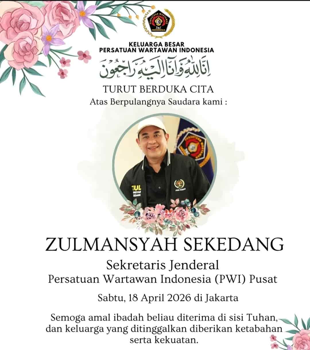 Jakarta, Mapress.co.id – Kabar duka menyelimuti dunia pers Indonesia. Sekretaris Jenderal (Sekjen) Persatuan Wartawan Indonesia (PWI) Pusat, Zulmansyah Sekedang (53) telah menghembuskan nafas terakhirnya, Sabtu 18 April 2026, pukul 00.10 dini hari WIB, di Rumah Sakit Budi Kemuliaan, Jakarta, akibat serangan jantung.
