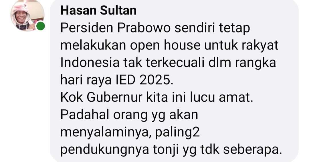 “Presiden Prabowo sendiri tetap melakukan open house untuk rakyat Indonesia tak terkecuali dlm rangka hari raya IED 2025. Kok Gubernur kita ini lucu amat. Padahal orang yg akan menyalaminya, paling2 pendukungnya tonji yg tdk seberapa,” kesal Hasan Sultan, di akun media sosial Facebook.