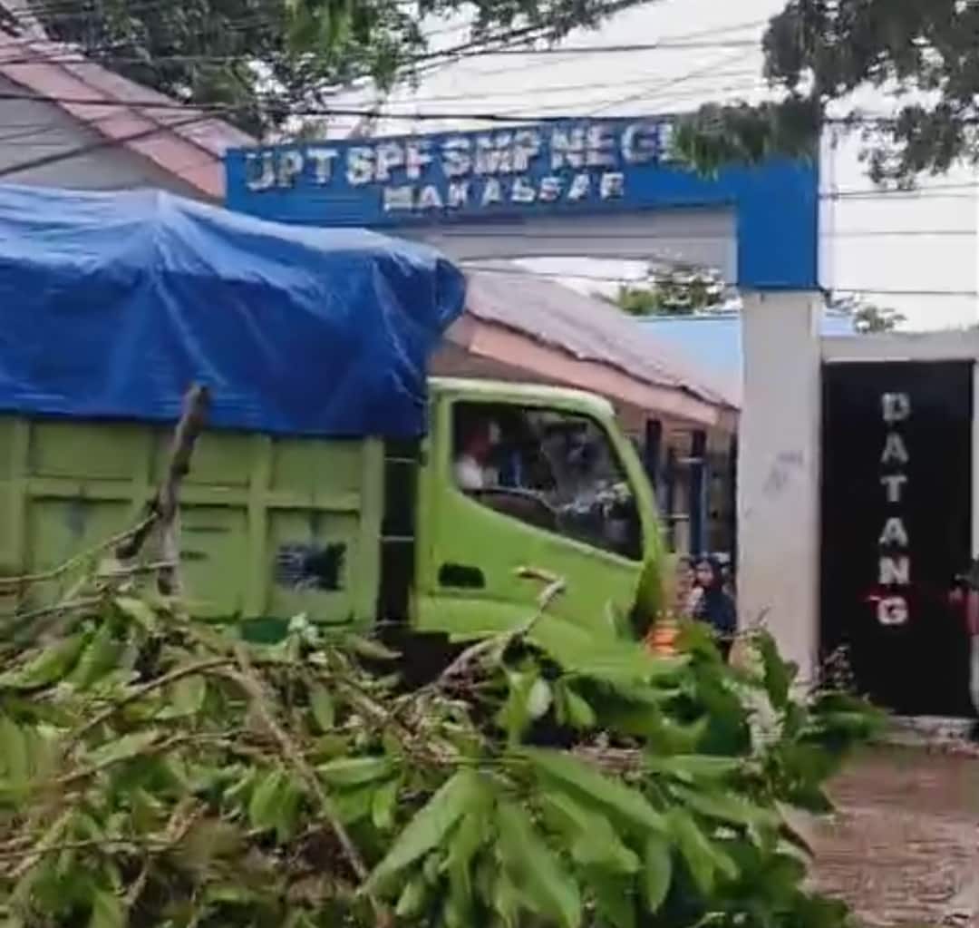 Angin Kencang dan Pohon Tumbang Akibatkan Satu Mobil Lecet dan Atap Seng Kelas Terbang di SMPN 9 Makassar