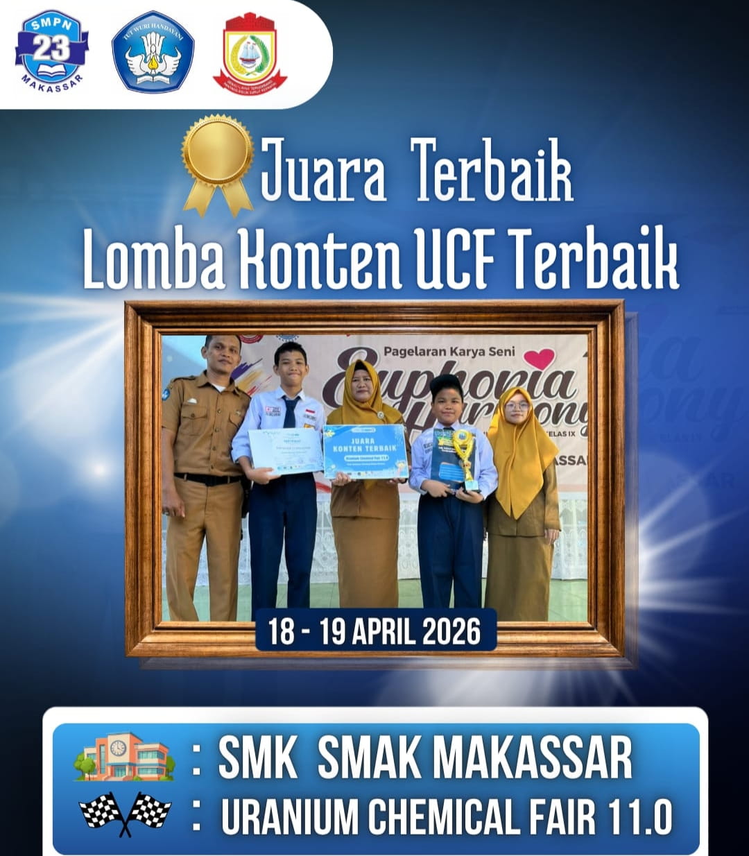 Peserta didik atas nama Muh. Arif berhasil meraih Juara Terbaik Lomba Konten UCF, yang dilaksanakan SMAK Makassar, dalam kegiatan Uranium Chemical Fair 11.0, yang diselenggarakan pada tanggal 18-19 April 2026.