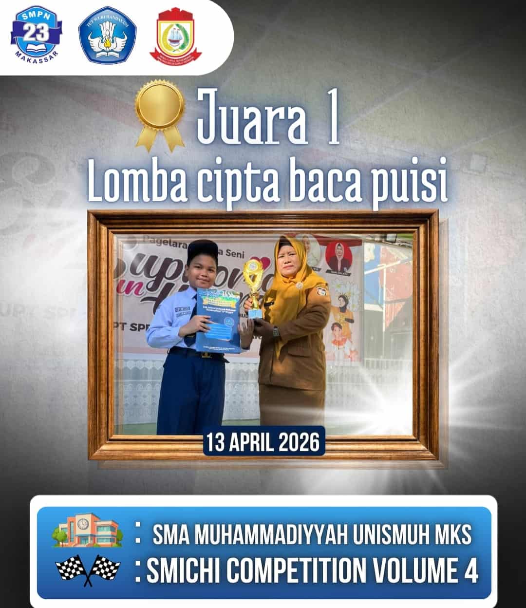 Sedangkan peserta didik lainnya, atas nama Khaerin Al Hafan berhasil meraih Juara 1 Lomba Cipta Baca Puisi, yang dilaksanakan SMA Muhammadiyyah Unismuh Makassar, dalam kegiatan Smichi Competition Volume 4, yang diselenggarakan pada tanggal 13 April 2026.