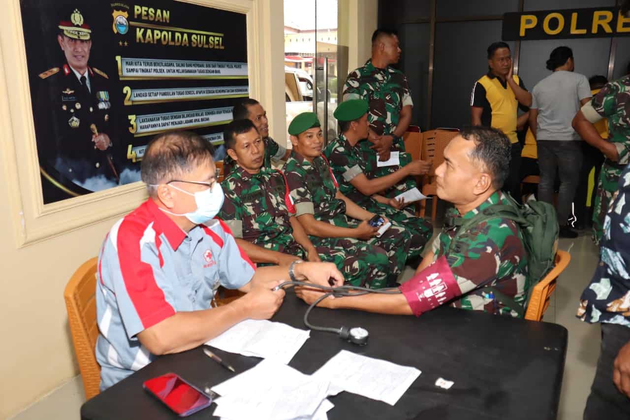 Takalar, Mapress.co.id – Memperingati HUT Bhayangkara ke-79 Tahun 2025, Perseonel Kodim 1426/Takalar ikut mendonorkan darahnya pada acara Bakti Kesehatan Donor Darah bertempat, di Aula Mapolres Takalar, Kelurahan Kalabbirang, Kecamatan Pattallassang, Kabupaten Takalar, Jum’at (20/06/2025).