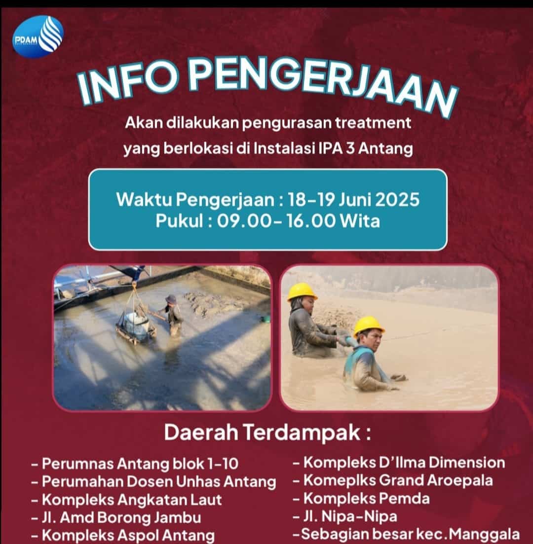 Makassar, Mapress.co.id – Perusahaan Daerah Air Minum (PDAM) Kota Makassar akan melakukan kegiatan pengurasan instalasi pengolahan air (treatment) yang berlokasi di Intake dan Instalasi IPA 3 Antang, tanggal 18–19 Juni 2025, mulai pukul 09.00 hingga 16.00 Wita.
