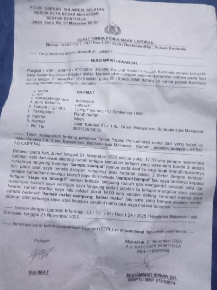 Laporan tersebut teregistrasi dalam STPL Nomor: STPL/51/XI/Res.1.24/2025/Restabes Mks/Polsek Bontoala, Jumat (21/11/2025).