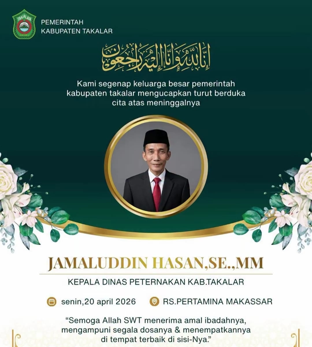 Takalar, Mapress.co.id – Kabar duka menyelimuti jajaran Pemerintah Kabupaten Takalar. Kepala Dinas Peternakan dan Kesehatan Hewan Kabupaten Takalar, Jamaluddin Hasan, SE, MM, dikabarkan meninggal dunia, Senin (20/04/2026).