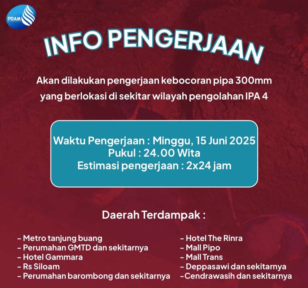 “Kami mohon maaf atas ketidaknyamanan pelanggan yang terdampak. Pekerjaan ini merupakan bagian dari upaya menjaga keandalan jaringan distribusi air. Kami juga menghimbau masyarakat untuk menampung air sebelum pengerjaan dimulai,” ujar Rommy.