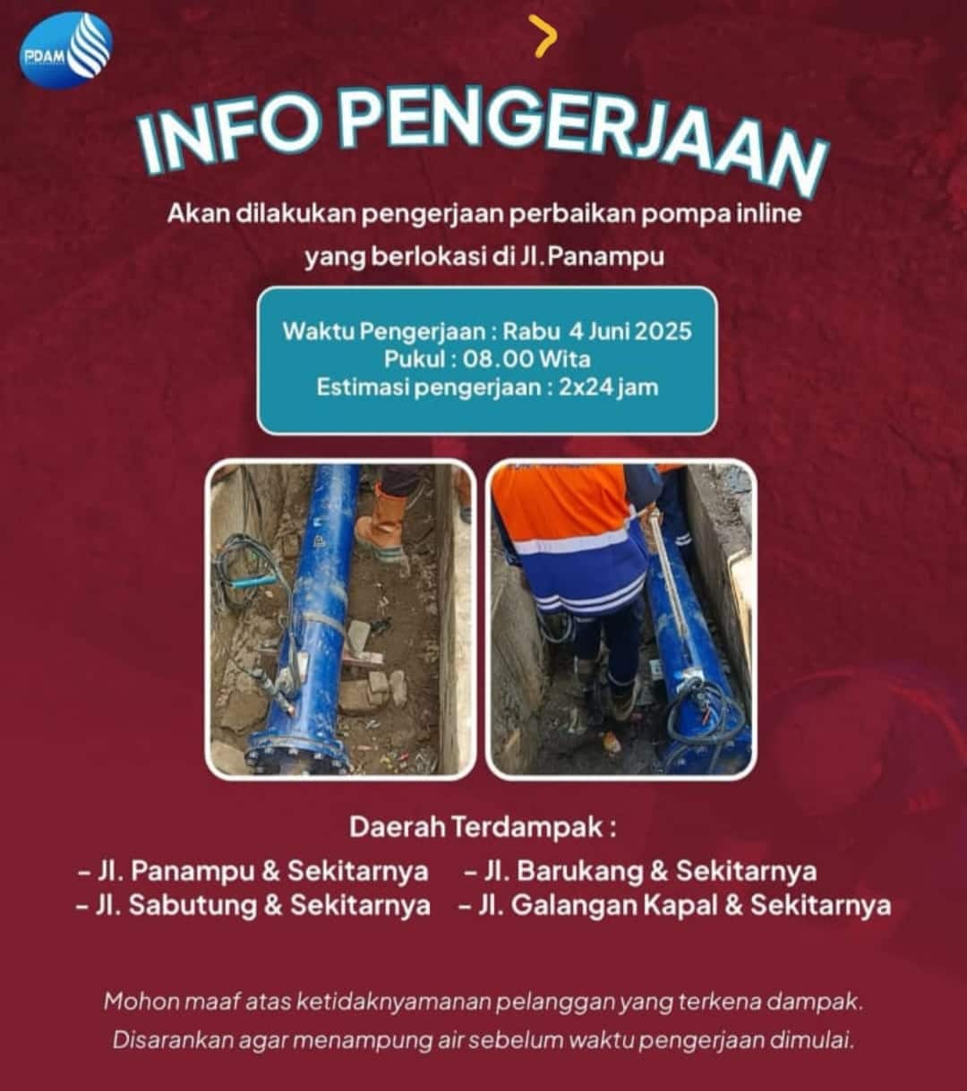 Makassar, Mapress.co.id – Perusahaan Daerah Air Minum (PDAM) Kota Makassar akan melakukan pekerjaan perbaikan pada pompa inline di wilayah Pannampu, yang dijadwalkan berlangsung, Rabu (05/06/2025).