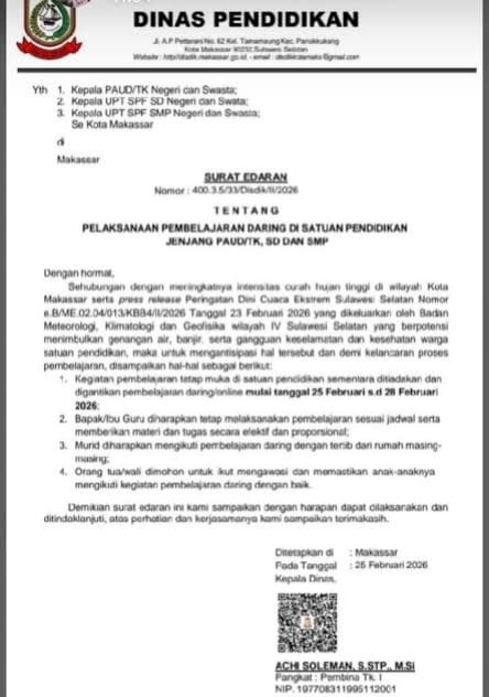 Kebijakan tersebut merupakan tindaklanjut dari Surat Edaran Dinas Pendidikan Makassar Nomor 400.3.5/33/Disdik/II/2026 yang mengatur pelaksanaan pembelajaran secara daring bagi satuan pendidikan tingkat PAUD/TK, SD, hingga SMP sebagai langkah antisipasi terhadap kondisi cuaca ekstrem.