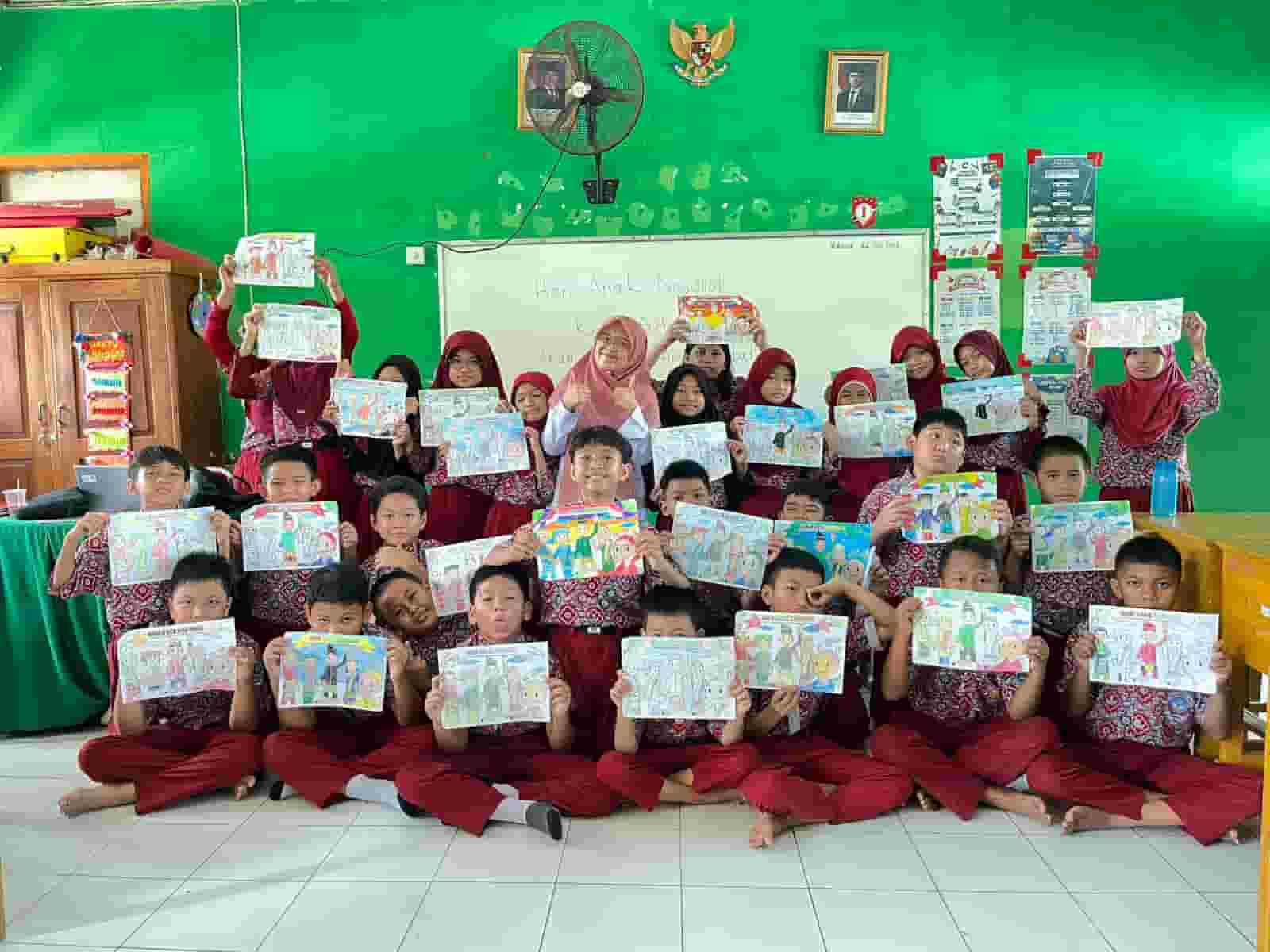 Dengan mengenakan seragam batik merah khas sekolah, para siswa menunjukkan hasil mewarnai mereka secara serentak, menciptakan suasana penuh warna dan keceriaan.