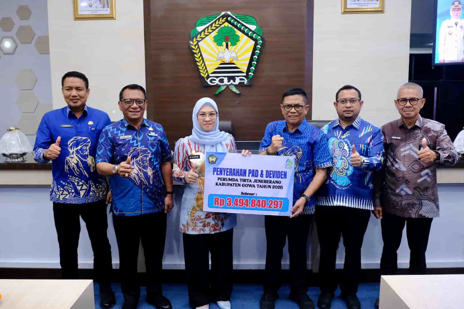 Gowa, Mapress.co.id – Pemerintah Kabupaten Gowa menerima setoran Pendapatan Asli Daerah (PAD) dan dividen sebesar Rp3.494.840.297,- dari Perusahaan Umum Daerah (Perumda) Air Minum Tirta Jeneberang Tahun Buku 2025, di Baruga Karaeng Pattingalloang, Kantor Bupati Gowa, Jumat (10/04/2026).