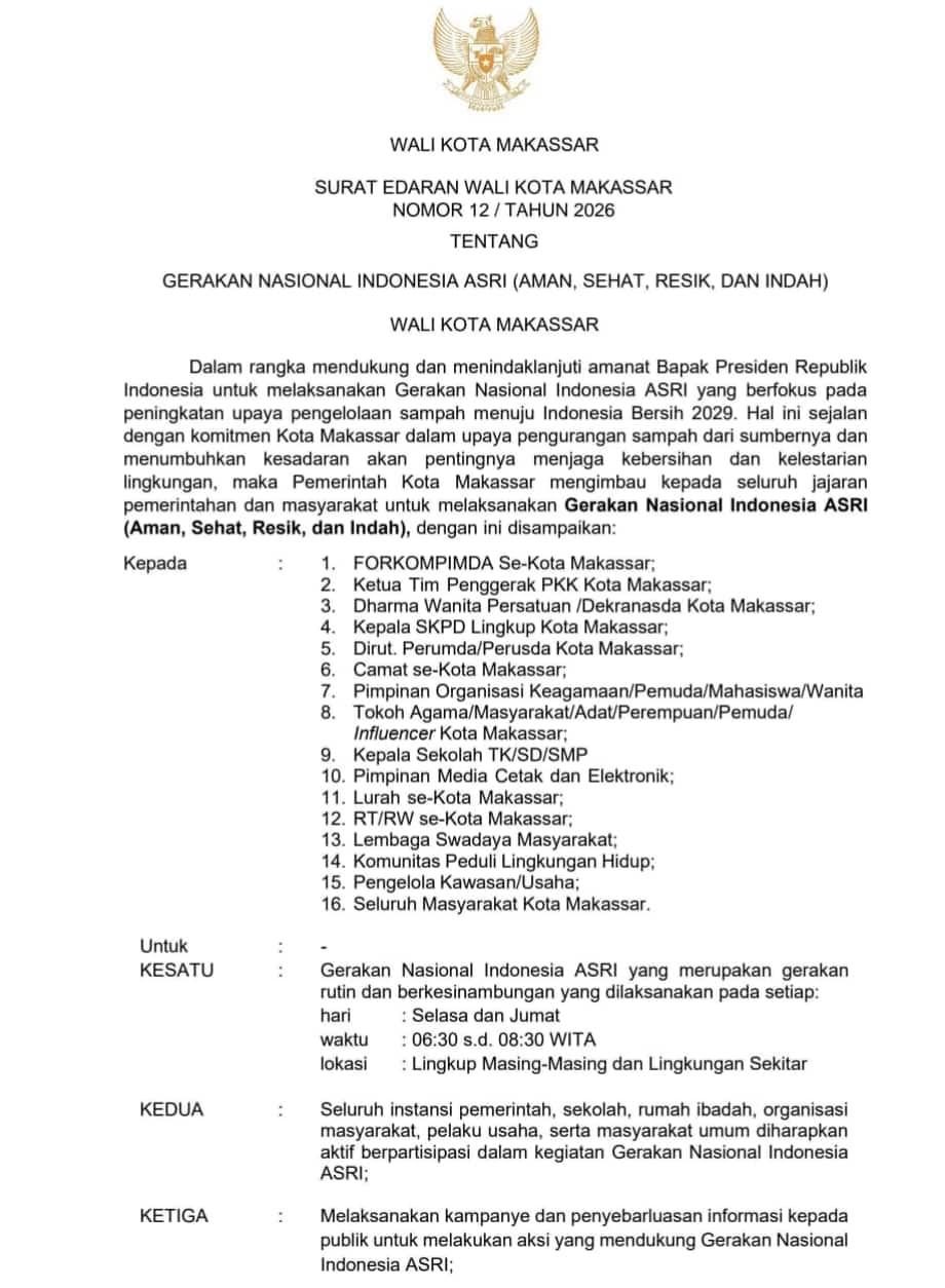 Makassar, Mapress.co.id – Wali Kota Makassar, Munafri Arifuddin, resmi menerbitkan Surat Edaran (SE) Nomor 12 Tahun 2026 tentang Gerakan Nasional Indonesia ASRI (Aman, Sehat, Resik, dan Indah).