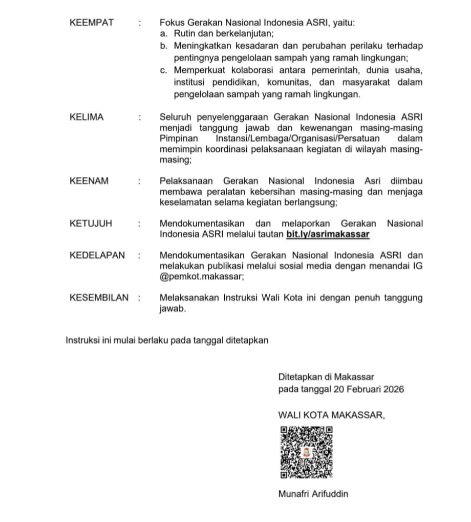 Dalam surat edaran yang ditetapkan di Makassar 20 Februari 2026 tersebut, Munafri menginstruksikan kepada seluruh SKPD, kepala dinas, camat, lurah, hingga direksi BUMD untuk berperan aktif menyukseskan Gerakan Indonesia ASRI.