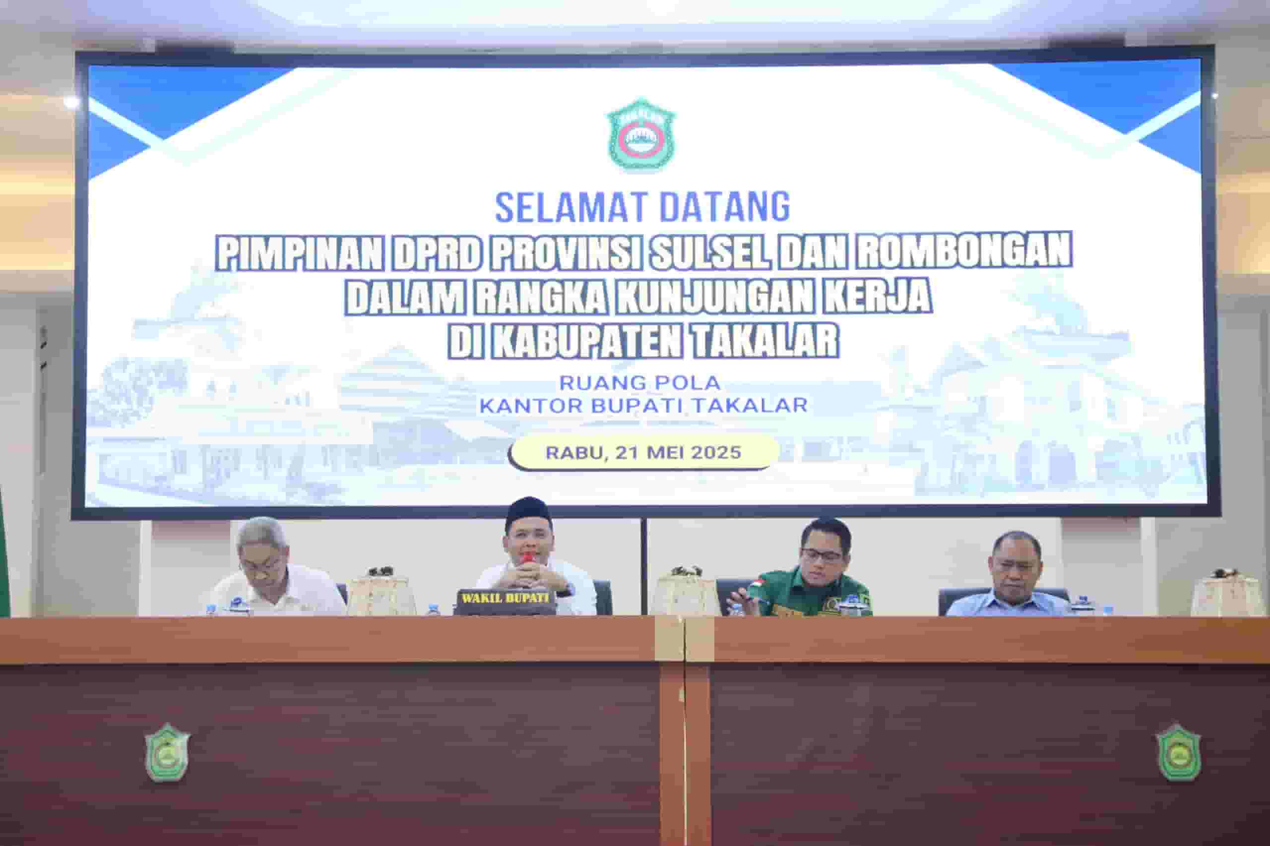 Kedatangan Pimpinan dan Anggota Banggar DPRD Sulsel disambut langsung oleh Wakil Bupati Takalar, Dr. H. Hengky Yasin, S.Sos, MM, di Ruang Pola Kantor Bupati Takalar, dan dihadiri Pimpinan OPD, serta Camat se-Kabupaten Takalar, Rabu (21/05/2025).