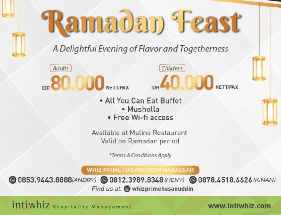 Sebagai nilai tambah, Whiz Prime Hasanuddin Makassar juga menghadirkan penawaran Buy 10 Get 1 Free, yang menjadikan Ramadan Feast sebagai pilihan ideal untuk acara buka puasa bersama keluarga, rekan kerja, maupun komunitas.